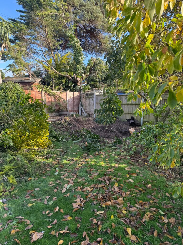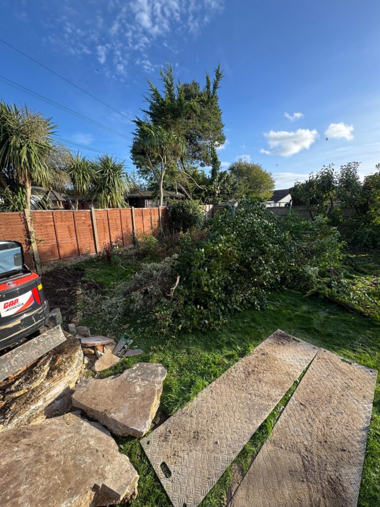 When we first arrived on site, the garden was heavily overgrown — dense shrubs, fallen branches, and years of unchecked growth had left the space unusable. Before any landscaping work could begin, the area needed a full clearance. Using a mini excavator, we removed the existing vegetation, old rockery stones, and debris to give us a clean, level canvas to work from.