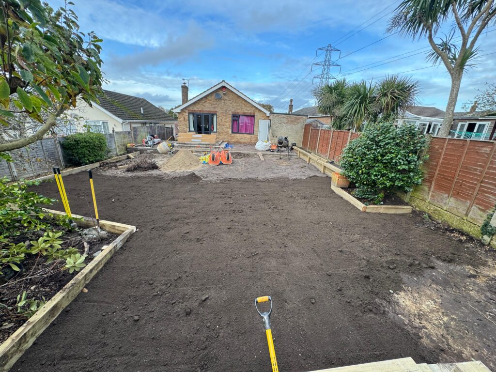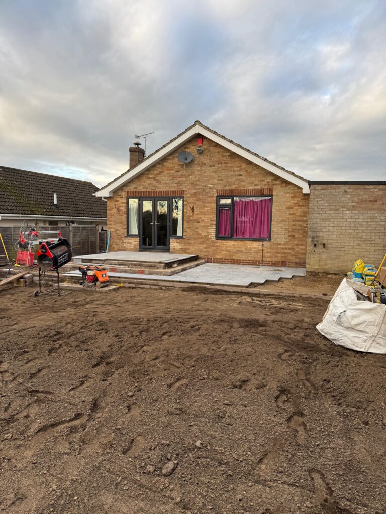 With the garden cleared, we got to work on the groundworks. The soil was graded and levelled, raised bed borders were formed using fresh timber, and the sub-base was carefully prepared to ensure a solid, long-lasting foundation for the new patio. Getting this stage right is crucial — it’s what separates a patio that lasts from one that shifts and cracks within a few years.