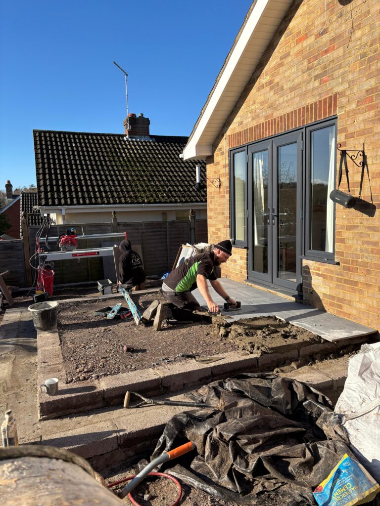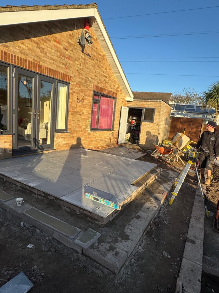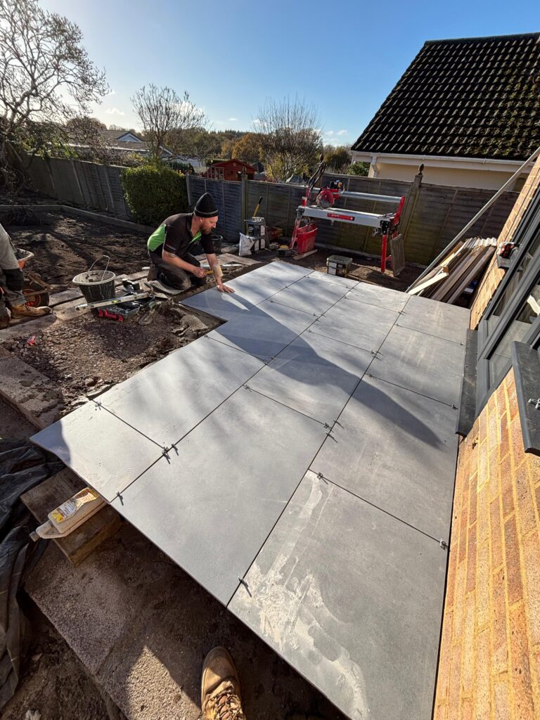 With the groundworks complete, our team began laying large-format porcelain paving slabs across the patio and pathway areas. Each slab was set on a full mortar bed and checked with a laser level and spirit level to ensure a perfectly flat, even finish throughout. The attention to detail at this stage is something we take real pride in — no shortcuts, every slab perfectly placed.