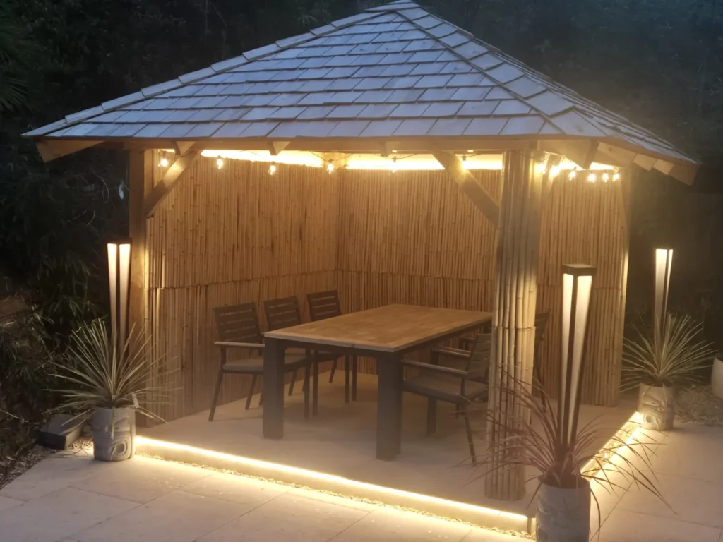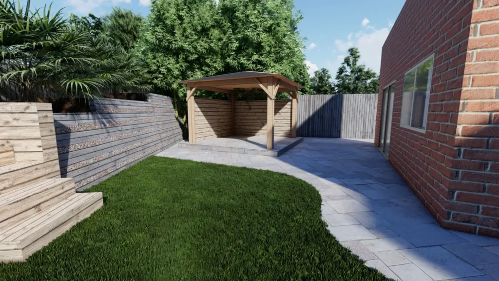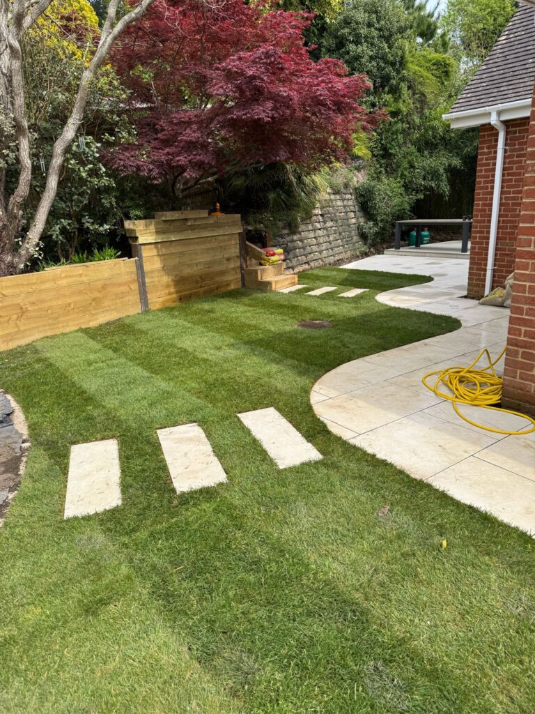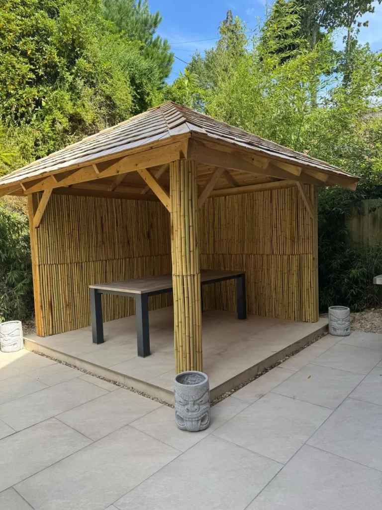 Once the paving was laid, attention turned to constructing the bespoke covered structure. The addition of bamboo cladding created an incredibly inviting feature, offering shelter, privacy and a touch of tropical personality.The lawn was reshaped and newly laid, softening the overall aesthetic and giving the garden a practical centrepiece.