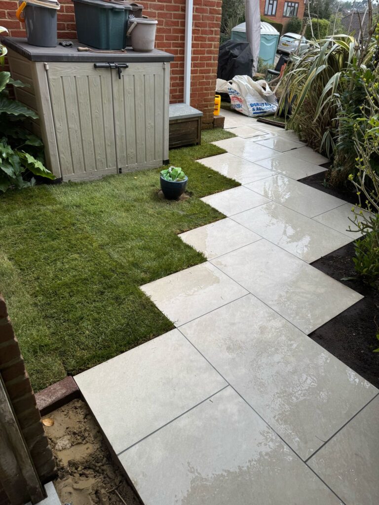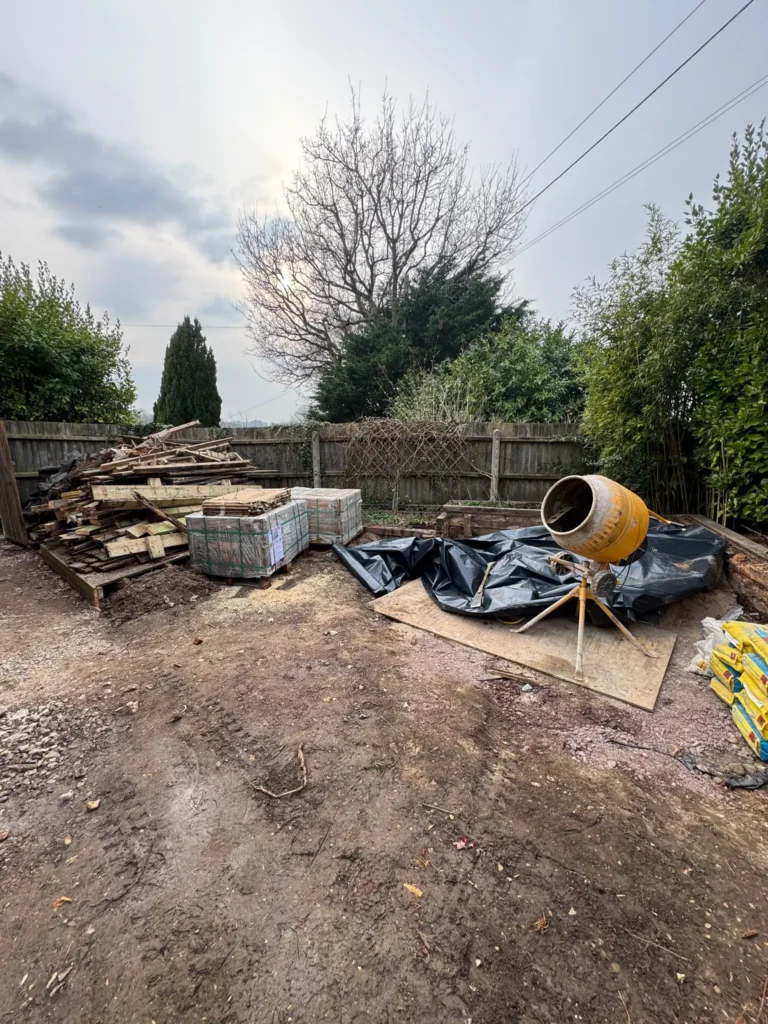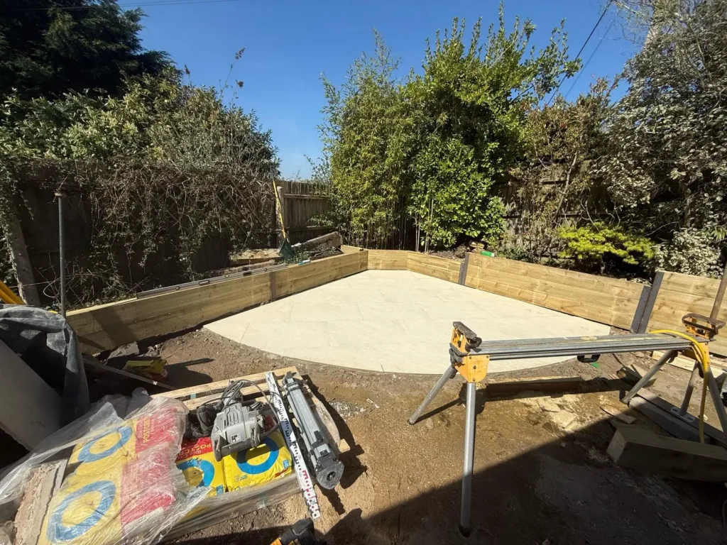 With the design agreed, our team began by clearing the site and dismantling the old decking. The levels were then reworked, and new foundations prepared for both the porcelain terrace and the pergola.