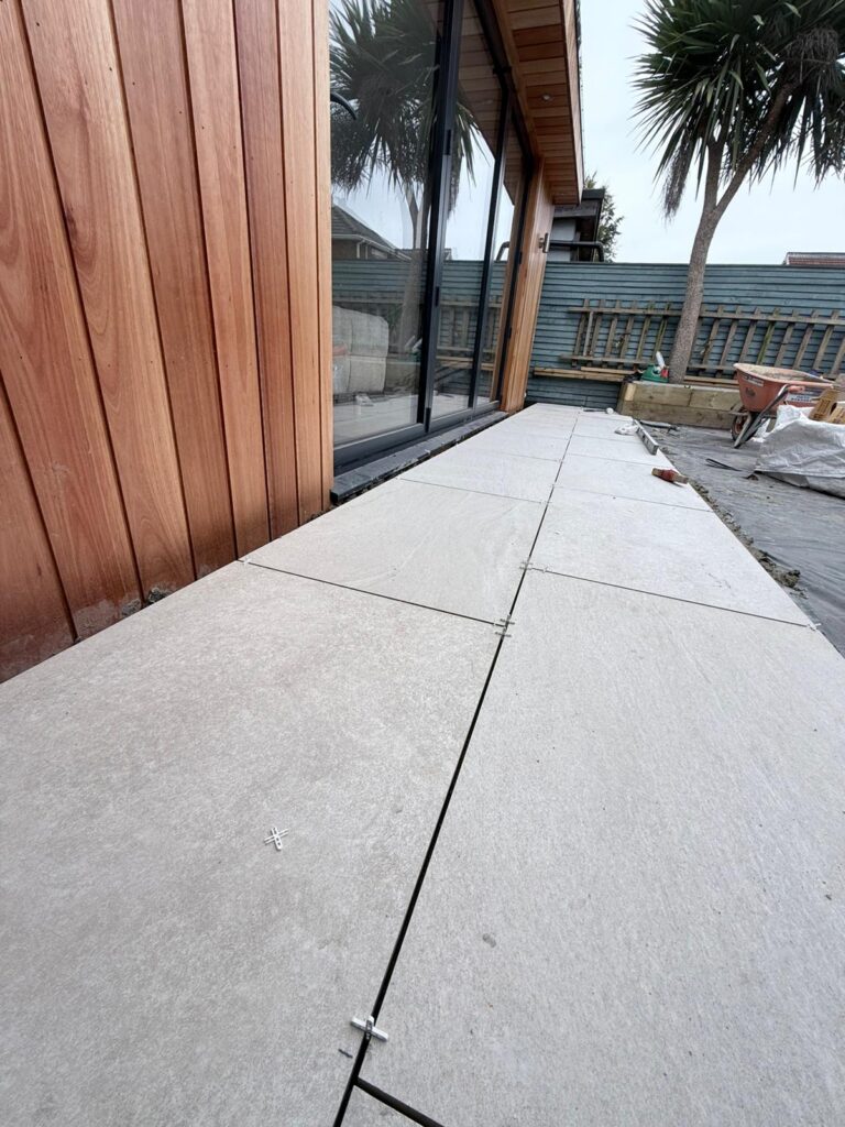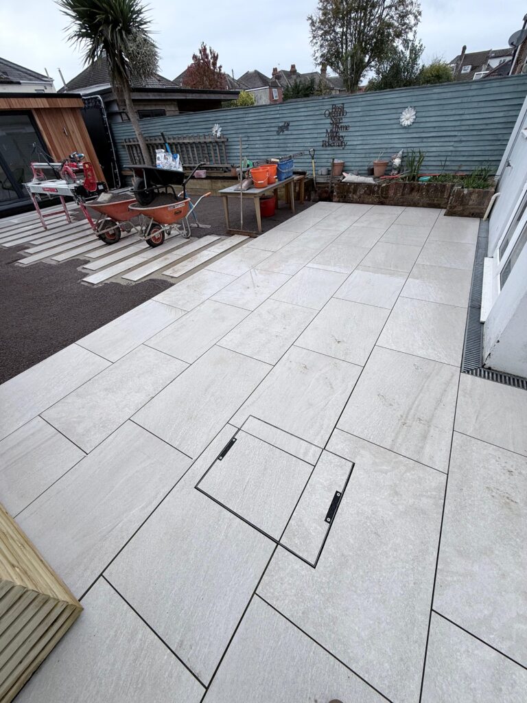 The centrepiece of the new garden design is a large porcelain patio installed directly outside the property. Porcelain paving is becoming increasingly popular in modern landscaping projects because it offers several key benefits: