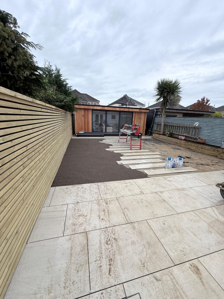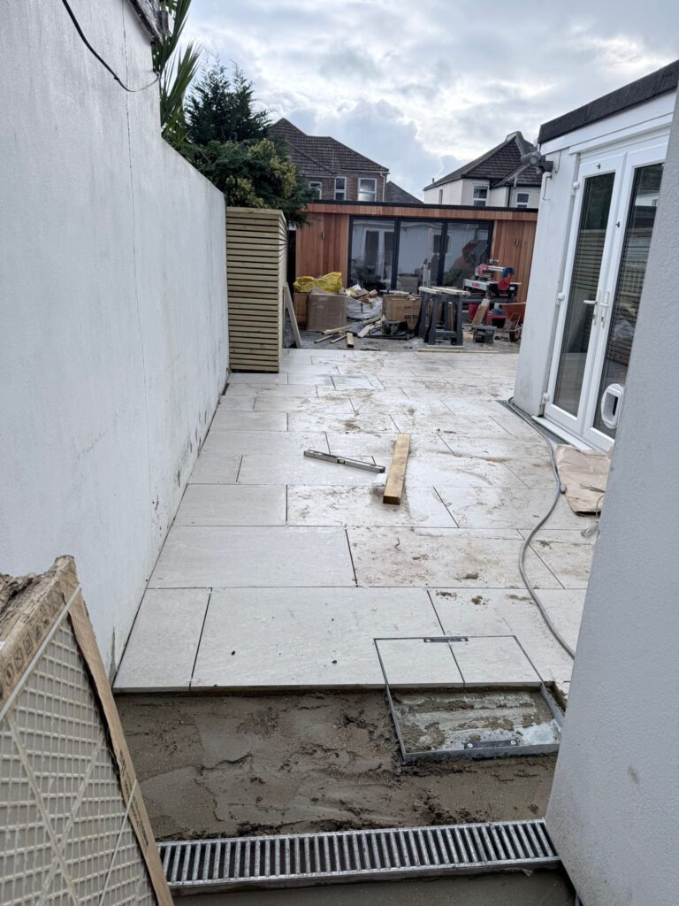 Careful attention was given to the layout of the paving slabs to create a clean, balanced finish. Precise cutting and levelling ensured the patio flowed seamlessly from the house into the rest of the garden.